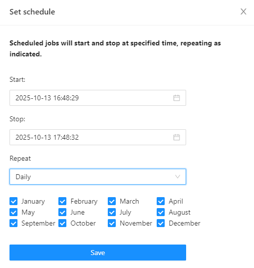 Enhanced schedule notifications: The system now displays warning messages when a schedule is saved but cannot start immediately (e.g., waiting for time synchronization).